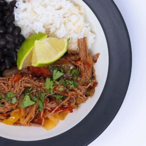 A plate of food with a variety of dishes including rice, beans, meat, and vegetables. The plate is on a table with a black rimmed plate underneath it. There are two lime wedges on the plate, one on the left side and one on the right side. The food is garnished with cilantro and there are diced tomatoes and onions visible. | Slow Cooker Ropa Vieja | 816cf1031d8aac88f6862c91122859ecdb4c21a5b0cbde3da754111d16717f85 | 001065767663 | 0 | 0 | 61 | 4 | 0 | 0 | |