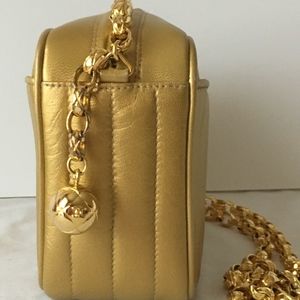 A golden handbag with a chain strap is displayed against a white background. The handbag has a textured surface and a circular gold emblem on the front. The chain strap is also golden and appears to be attached to the handbag with a gold clasp. | CHANEL Bags - CHANEL Gold Lambskin Camera Bag w Gold Ball Zipper | 861f196e02e7a16dad47e86655a9af9c5da89e1260073214aa3adba0964e68ef | 001065768419 | 0 | 0 | 45 | 12 | 0 | 0 | |