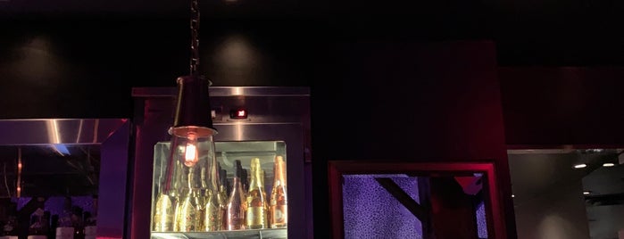 A modern bar setting with a sleek, metallic refrigerator and a glass display case filled with various bottles. The refrigerator has a red light glowing at the bottom, and the display case is illuminated by a hanging light fixture with a unique design. The walls are dark, and the overall ambiance is contemporary and sophisticated. | Pierre's Champagne Lounge is one of Vancouver Night Outs. | 226950b2dc9b54c4d9569384ddf2c52cac783d0a175a87bf8fa423b3921b81af | 001065768329 | 0 | 0 | 55 | 9 | 0 | 0 | |