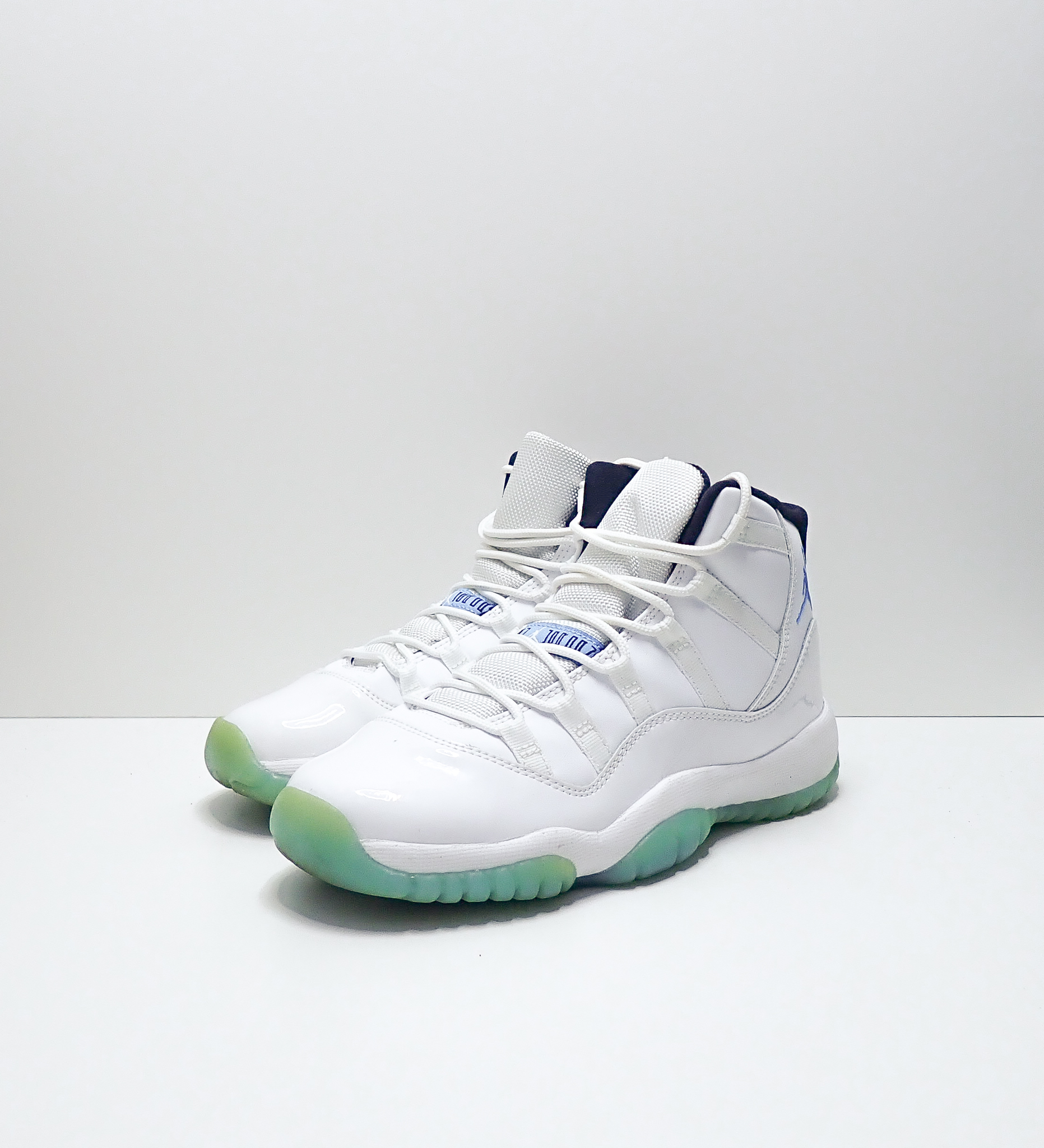 A pair of white sneakers with blue accents and green soles is displayed against a white background. The sneakers have a high-top design with a white upper, blue and white laces, and a white sole with a green glow effect. The shoes are placed on a white surface, and the background is a plain white wall. | Jordan 11 Retro Legend Blue 2014 (GS) | 936dc48c3c745570b6da09e9c67a34127bd001189e323e4916fdaaf1d844d44f | 001065768315 | 0 | 0 | 56 | 7 | 0 | 0 | |