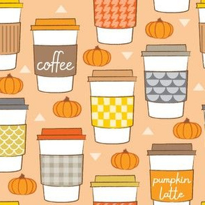 A collection of various coffee cups with different designs and text labels is arranged in a patterned background. The cups are filled with coffee, and the background features a repeating pattern of orange pumpkins and a beige texture. The cups have labels such as 'COFFEE', 'PUMPKIN LATTE', and 'COFFEE', among others. | coffee cups and pumpkins | 2bea649bed5bd7293e9dab91c4e6134f65c1c825e0e1f0aa4c17421189f8beb1 | 001065768360 | 0 | 0 | 51 | 4 | 0 | 0 | |