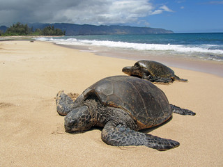 Two large sea turtles are resting on a sandy beach with waves in the background. | Two turtles in the sand in a beach in Hawaii | 50c9f948672f92020015329cdea6f1f591771bd3c59b8a0d2162226f07edbf27 | 001065768405 | 0 | 0 | 15 | 10 | 0 | 0 | |