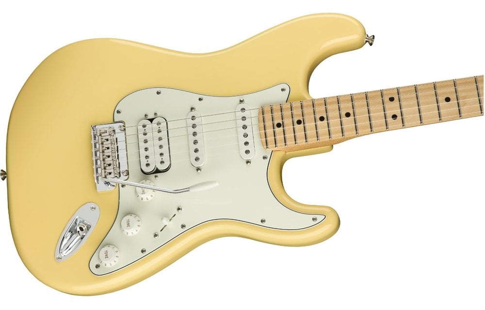 A white electric guitar with a glossy finish and a white pickguard is displayed against a white background. The guitar has a single humbucker pickup at the bridge and a volume and tone control knob on the upper bout. The fretboard is white with black fret markers, and the headstock has a white logo and tuning pegs. | Fender Player Stratocaster HSS, Maple Fingerboard, Buttercream | d3c910c8ea0bbf890dc8f55756194c8350f087daaa2ef695ec36fdfe0a06418d | 001065768514 | 0 | 0 | 57 | 7 | 0 | 0 | |