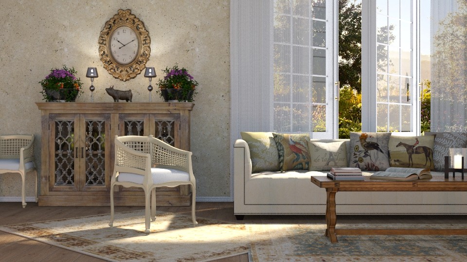 A cozy living room with a beige sofa adorned with patterned cushions, a wooden coffee table with books on top, a white wicker chair, and a wooden cabinet with a clock and decorative items. The room has a large window with sheer curtains, a patterned rug on the floor, and a wall clock above the cabinet. | Country Spring - Living room - by GraceKathryn | ea9c9f6b1fdcb8174461db9d09379f18a1b816fd14d50b5d74631b38b99dd421 | 001065768413 | 0 | 0 | 56 | 8 | 0 | 0 | |
