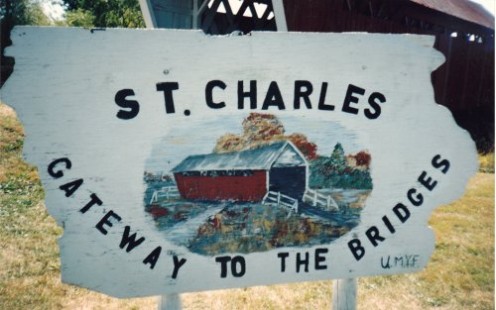 A weathered wooden sign with a faded paint job, featuring the words 'ST CHARLES GATEWAY TO THE BRIDGES' in a decorative font. The sign has a painted image of a red barn with a white roof, surrounded by trees and a fence. The sign is mounted on a pole and appears to be in a rural or countryside setting. | For accuracy's sake, St. Charles is only the "gateway to the bridges" if you're coming into Madison County from Interstate 35 (see map above) at the eastern edge of the county. | 2b95dc96adf05e7dcee4178a5414370d74786577d48664971bf93f048d250dd6 | 001065768552 | 0 | 0 | 59 | 31 | 0 | 0 | |