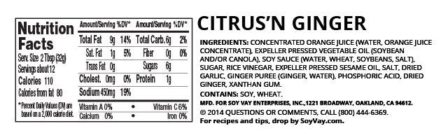 A nutrition label for 'Citrusn Ginger' with various nutritional information such as serving size, calories, fat, carbohydrates, and vitamins. The label also includes a disclaimer stating that the product is not intended to diagnose, treat, cure, or prevent any disease. | Citrus 'N Ginger Dressing nutritional information | 085774c5aab14446475ed45596f3f80e915ba8ad86aecfb7bd5de7b16f05f0e3 | 001065768519 | 0 | 0 | 40 | 6 | 0 | 0 | |