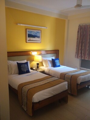 A cozy hotel room with two beds, each with a blue pillow and a white comforter. The room has a yellow wall with a framed picture of a boat on the water. There is a lamp on a bedside table, and a window with a red and white curtain. The floor is carpeted, and there is a ceiling fan above. | Executive Double Room, 1 Bedroom, Smoking, Garden View | Room | ae741f17187a0c92ef056a18da97d7be072124cb81446aeaee4e8624040e2b08 | 001065768759 | 0 | 0 | 60 | 10 | 0 | 0 | |