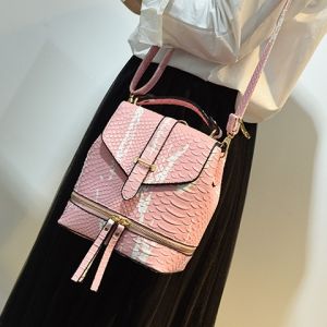 A woman is wearing a white shirt and a black skirt, holding a pink snake skin patterned shoulder bag with a gold zipper and a pink tassel. | Fashionable Color Block and Embossing Design Backpack For Women - PINK | 71783a5f7a0c462452c7e695da6a86c55b0d81f2ca1890773825cde362dabb86 | 001065769011 | 0 | 0 | 27 | 11 | 0 | 0 | |