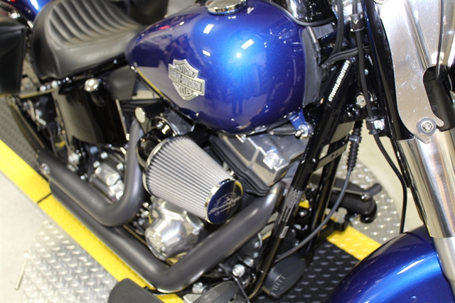 The first image shows a close-up of a motorcycle's engine and front wheel. The engine is predominantly blue with silver and black accents, and it features a prominent Harley-Davidson logo on the side. The front wheel is also blue with a silver rim, and the motorcycle is positioned on a floor with a yellow line running along the side. The background is out of focus, but it appears to be a workshop or garage setting. | 2015 Harley-Davidson Softail Slim at Platte River Harley-Davidson | d0a665a8046f2f70929b1dfc95f9b96d1e170d1ac381017000dbb960cc534cc2 | 001065768969 | 0 | 0 | 75 | 8 | 0 | 0 | |