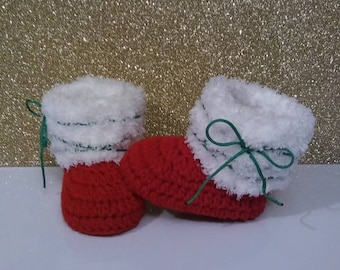 A pair of red crocheted baby shoes with white fur trim and green ribbons are placed on a white surface with a golden glittery background. | Christmas baby girl boots, Christmas baby boy boots, baby girl boots, baby boy boots, baby gift, baby shower gift, stocking stuffer, outfit | d946e70aee09ea84fbd0a26b014d6eac6989bb87de3909bd952e77320152b9b5 | 001065745191 | 0 | 0 | 25 | 22 | 0 | 0 | |