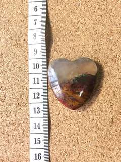 A heart-shaped stone with a glossy surface and a gradient of colors from red to brown is placed on a corkboard. A ruler is positioned next to the stone, with the zero end of the ruler touching the bottom edge of the corkboard. The ruler has markings for centimeters and millimeters, and the zero end is at the bottom left corner of the image. | Heart shape moss agate | e1f74f09a631d6bde36868a39a3bee046c4befdbb5f83644304172a6af4f9dfa | 001065745235 | 0 | 0 | 64 | 4 | 0 | 0 | |