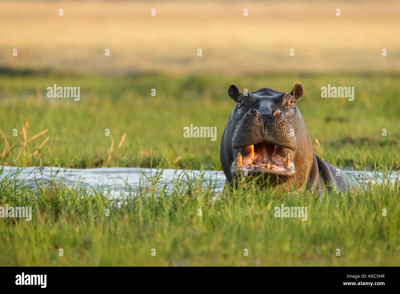 A hippopotamus is standing in shallow water with its mouth open, surrounded by tall grass. The image has a warm, golden tone, suggesting it was taken during the golden hour. The hippopotamus is looking directly at the camera, and the background is filled with grass and a clear sky. | Hippopotamus in Wasser. Okavango Delta, khwai, Botswana Stockbild | 66ae83898542d85ecc4612878fda0efa7c35a9c913cf41579cb40eb1decdba49 | 001065769156 | 0 | 0 | 49 | 8 | 0 | 0 | |
