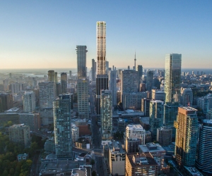 A modern cityscape with a clear blue sky. The skyline features a variety of buildings, including a prominent skyscraper with a green stripe running up its center. The city appears to be bustling with activity, and the overall atmosphere is one of a busy urban environment. | Toronto\xe2\x80\x99s newest hotel is set to be the tallest building in Canada. | 8d2df9c28d8549afeccdfd297ee40f3c9e0683bccd4da2bcf2d77b0f91aebb5d | 001065769094 | 0 | 0 | 46 | 12 | 0 | 0 | |
