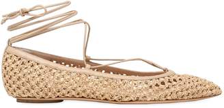 A pair of beige high-heeled sandals with a woven design on the upper part of the shoe and a thin strap that wraps around the ankle. The sandals have a pointed toe and a high, curved heel. | Casadei 10mm Woven Lace-Up Ballerina Flats | 9464da84abe9c8263ceb55629dcafc7ec78808c872c3007c11104431d24ed14b | 001065769159 | 0 | 0 | 37 | 6 | 0 | 0 | |
