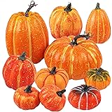 A collection of six pumpkins with various patterns and textures is displayed against a white background. The pumpkins are arranged in a way that showcases their unique characteristics, with some featuring a smooth surface and others having a more textured appearance. The largest pumpkin is on the left, followed by a smaller one with a striped pattern, then a pumpkin with a bumpy texture, and so on. The smallest pumpkin is on the right, with a pattern that resembles a spider web. | FUNARTY Package of 10 Harvest Artificial Pumpkins Assorted Size Fall Pumpkins for Autumn, Halloween and Thanksgiving Decorati | c60cb187dac67f69f81a3089ce5b9b3733573838f2b2c3c0ed4b0150075dffa2 | 001065769426 | 0 | 0 | 82 | 17 | 0 | 0 | |