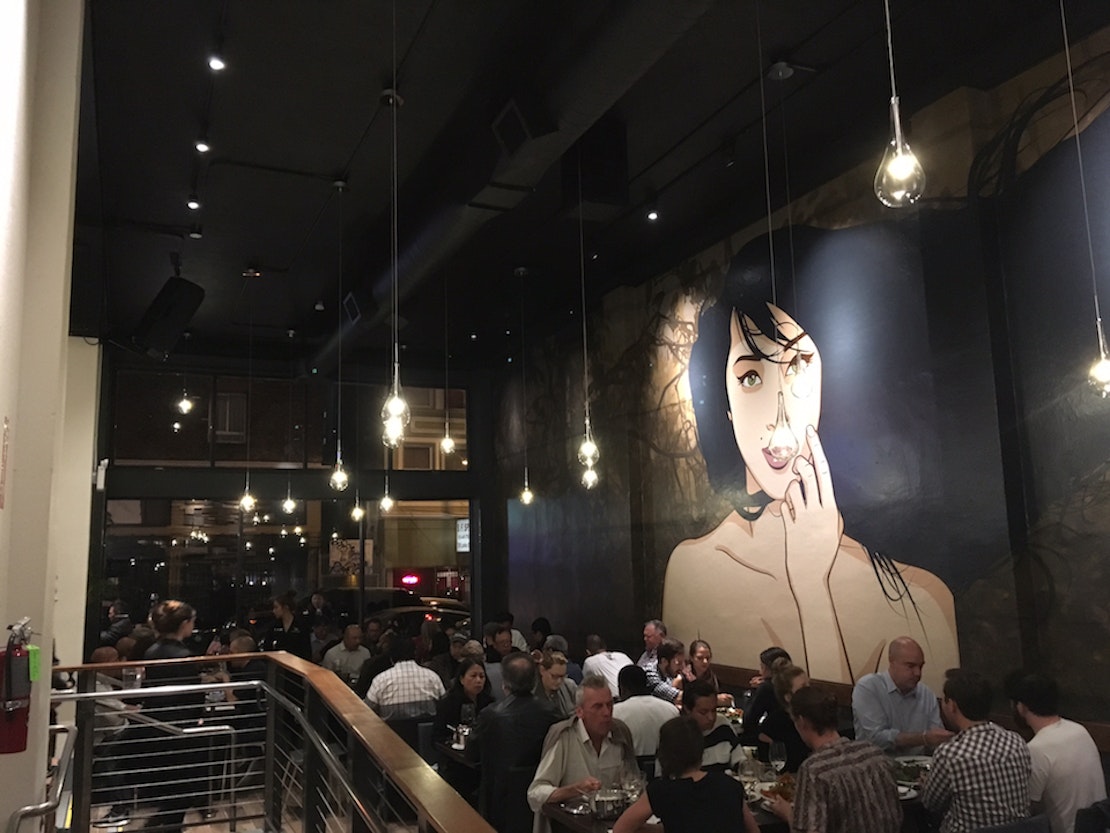 A bustling restaurant scene with a large group of people seated at tables and a bar. The restaurant has a modern design with a large painting on the wall depicting a woman's face. The patrons are engaged in conversation and enjoying their meals. The lighting is warm, and the atmosphere appears lively and social. | 'Esan Classic' Opens Across from 'Lers Ros Thai' In Tenderloin | 541f331119c82037879fcccb6d9c17d9d89c785e2cd44b46b32d2cfa5345b170 | 001065769451 | 0 | 0 | 54 | 10 | 0 | 0 | |
