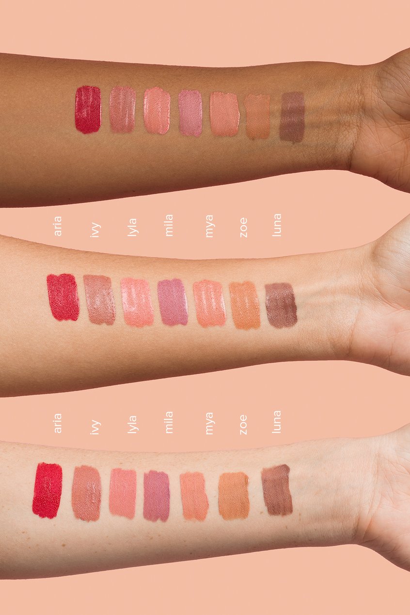 The first image shows two arms with a gradient of lipstick shades applied to the skin. The shades range from a deep red at the top to a light pink at the bottom. The arms are positioned against a pink background, and the image is overlaid with text labels for each shade, starting from 'A' at the top and ending at 'L' at the bottom. The text is in a foreign script, possibly Japanese. | Beauty Gift Shop | Liquid lipstick - XU92166 | b17399fea7a3bb045eb4d2fcc05d6e22ee0fb77da5f324103454920ef2851f05 | 001065769467 | 0 | 0 | 74 | 8 | 0 | 0 | |