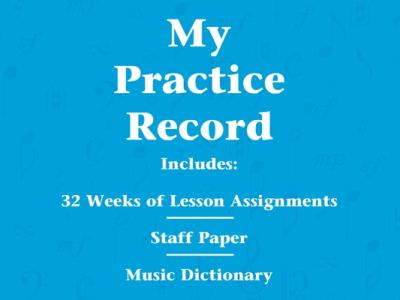 The second image is a close-up of the first image, focusing on the central part of the book cover. The title 'My Practice Record' is prominently displayed in the center, with the subtitle 'Includes: 32 Weeks of Lesson Assignments / Staff Paper / Music Dictionary' below it. The background features musical notes and symbols, and the color scheme is predominantly blue with white and black text. | My Practice Record | 4e6888292f42565ab5e42b59e82eae345db59c70e3c0a21784e2d5328036acc7 | 001065769950 | 0 | 0 | 66 | 3 | 0 | 0 | |