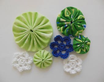 A collection of crocheted items is displayed on a white surface. There are three green crocheted items, each with a different design: one with a spiral pattern, one with a starburst pattern, and one with a circular pattern. Next to these, there are two blue crocheted items: one with a floral pattern and one with a geometric pattern. The items are arranged in a way that showcases their textures and colors. | Yo-Yos and Crocheted Flowers - Green, Blue and White - Cotton Appliques - Cotton Embellishments | 6bfbb0f8e4b4ca3a18b651154e53c3ad50e2f82e99aa58f8cd468601b3e768fe | 001065769942 | 0 | 0 | 71 | 15 | 0 | 0 | |