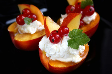 A close-up view of a plate with three halves of a peach, each topped with a dollop of whipped cream and garnished with a cherry and a sprig of mint. The peaches are sliced in half lengthwise, revealing the pit inside, and the whipped cream is piped onto the peach halves. The plate is placed on a dark surface, and the lighting highlights the textures and colors of the peaches, cream, and garnishes. | Peaches, Red Currants and Creamy Cheese Dessert | 9574ee8bc5c6120c19de0255796977247fee62af26df34ae6887b03288fc3eda | 001065769901 | 0 | 0 | 73 | 7 | 0 | 0 | |