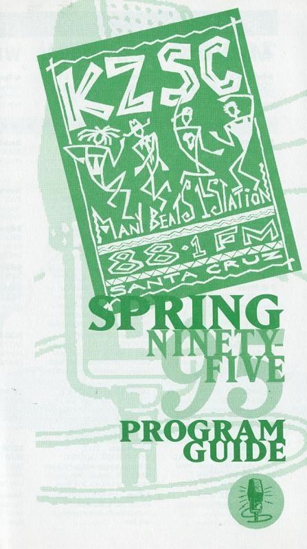 A vintage radio program guide featuring the KZSC logo and the title 'Spring Ninety Five' in bold letters. The guide includes a colorful illustration of a man and a woman dancing, with the text 'MAN BEAT JAZZ LICATIONATION' and '88.5 FM' written above and below them. The background is a green color with a pattern of lines and shapes. | kzsc guides 066 | 1df11ffc0e076b3e48a9600a4576ff3cf6cfd9eada3fbf69247492870d06eb5f | 001065769939 | 0 | 0 | 59 | 3 | 0 | 0 | |
