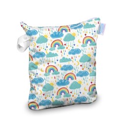A blue and white patterned pillow with a whimsical design featuring clouds, rain, and rainbow elements. The pillow has a white ribbon tie on the top left corner and a small tag with a blue heart and white lettering on the bottom right corner. | Deluxe Wet Bag Rainbow | 4bc714433be0b8071ecc237a812c6aaa2e817fdc40c16742995d7115c1fc4d0d | 001065770307 | 0 | 0 | 44 | 4 | 0 | 0 | |