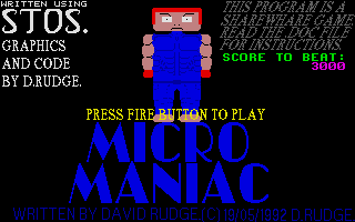 The second image is a retro-style advertisement for a video game called 'Micro Maniac'. It features a pixelated character with a red face and blue attire, standing in the center with a menacing expression. The background is dark, and the text is in a retro font, with various elements such as 'STOS', 'Graphics and Code', 'Score to Beat', and 'Press Fire Button to Play'. The advertisement has a nostalgic feel, reminiscent of early video game marketing. | Large screenshot of Micro Maniac | 27193ed3d257ec59878eddbcf082be3ca59e7ed6de69c46094cfaefa975a519e | 001065770228 | 0 | 0 | 76 | 5 | 0 | 0 |