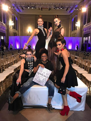 A group of models is posing on a runway with a seated model in the center holding a book titled 'Glamour'. The seated model is wearing a black dress, jeans, and red high heels. The other models are standing around her, dressed in various outfits, with one model in a black dress with a red belt and red high heels. The setting appears to be an indoor fashion event with rows of chairs and a backdrop of a curtain. | Yoro Creations models on the KCFW runway at Union Station | de0e739044fc65754781618985806e914d50816dc45be716c16a670015f8ae40 | 001065745388 | 0 | 0 | 79 | 10 | 0 | 0 | |