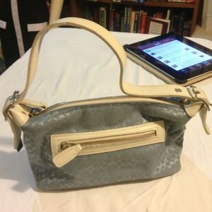 A blue and white patterned handbag with a white interior is placed on a white surface. The handbag has a long strap and a zipper closure. In the background, there is a bookshelf filled with various books, and a tablet displaying a social media feed is visible. | Coach Powder Blue / Beige Trim Handbag | 9630f28c96c353575866f42b314e3eaebeb68676df911ca53a0152ee2940ca1f | 001065745339 | 0 | 0 | 47 | 7 | 0 | 0 | |