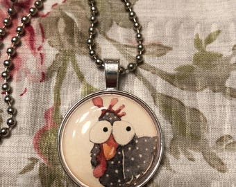 A close-up view of a silver necklace with a round pendant featuring a cartoon chicken design. The chicken has a white face with black eyes and a red beak, and a black body with white polka dots. The pendant is resting on a textured fabric with a floral pattern, and the background is blurred. | Chicken necklace | 43514fcbabcfad258058f9f0cfe15c5ddcaf665c7838aba0552a58aefbeb9359 | 001065745053 | 0 | 0 | 54 | 2 | 0 | 0 | |