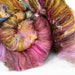 A close-up of a ball of yarn with a gradient of colors from purple to pink to yellow, with a textured surface and a few loose strands hanging down. | Dupioni 3oz Wool - Merino // Art Batt // Wool Art Batt for spinning or felting | f303f9d8a9772fdc016d7307f1a902334dcc2d2cf2e13b4def1c177a278e1c1c | 001065770893 | 0 | 0 | 29 | 16 | 0 | 0 | |