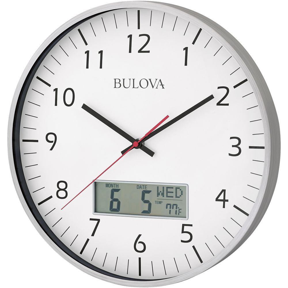 A modern digital wall clock with a white face and black hands, displaying the time in a digital format with red numbers. The clock has a black border and is mounted on a wall. The time reads 10:10, and the date is displayed as 'Wed 5/97'. The temperature is shown as 68\xc2\xb0F (20\xc2\xb0C). The brand name 'BULOVA' is written at the top of the clock. | 14 in. H x 14 in. W Round Wall Clock | 9c1965f5bee8daac39ff10f31fda89eee402c417a1d8303d05d85547d97929d1 | 001065770946 | 0 | 0 | 65 | 10 | 0 | 0 | |
