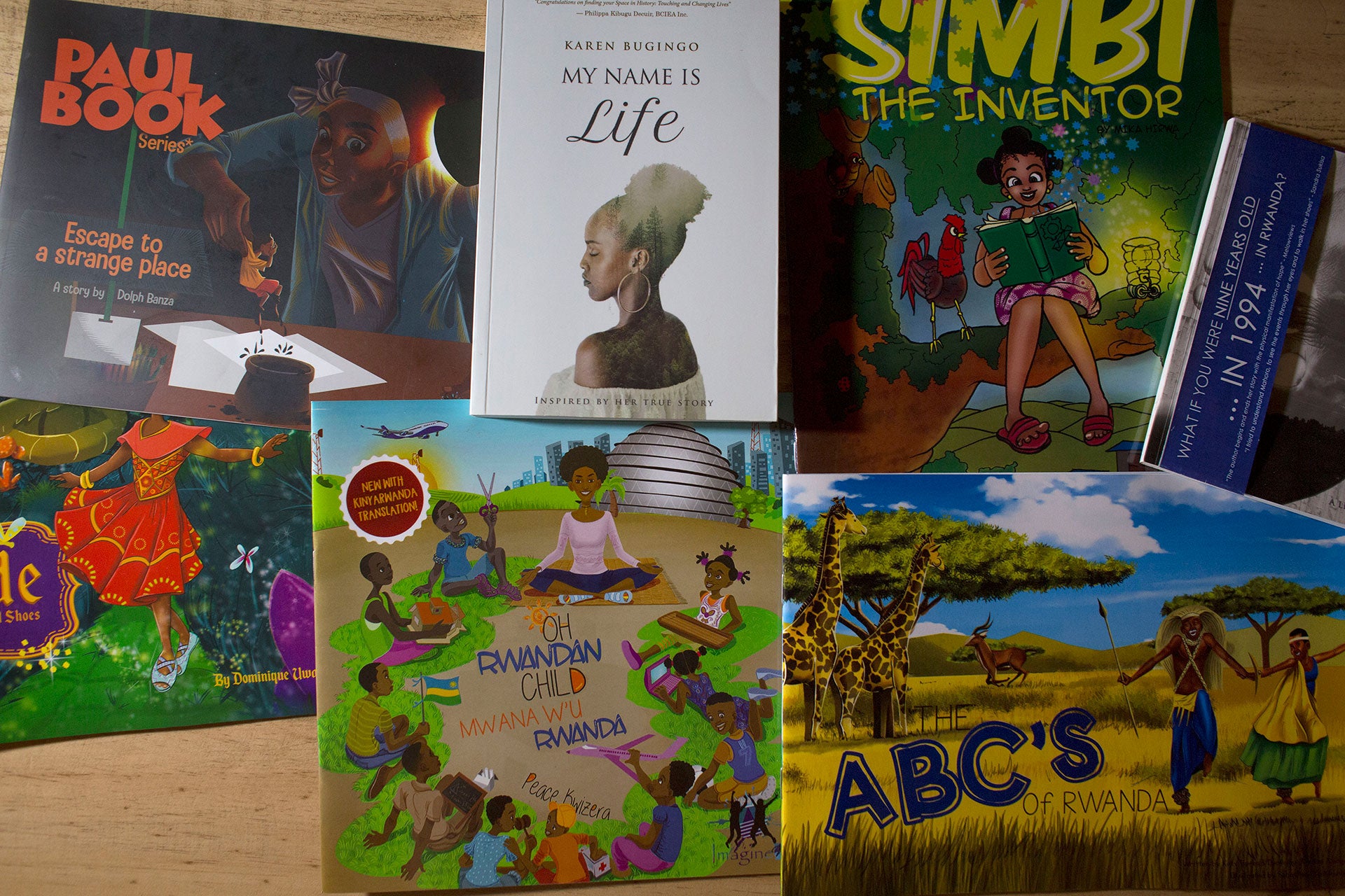 A collection of children's books is displayed on a wooden surface. The books are of various sizes and colors, with some featuring vibrant illustrations of children and animals. The titles include 'Simbi', 'My Name is Life', 'Escape to a Strange Place', and 'Rwanda's ABC's'. The books are arranged in a way that showcases their colorful covers and engaging content. | Some of the books published by Imagine We. | 5f29e2fcd408dff0b9bc14cc3141675f4ab00445aa912005395c023723d95dff | 001065771199 | 0 | 0 | 59 | 8 | 0 | 0 | |