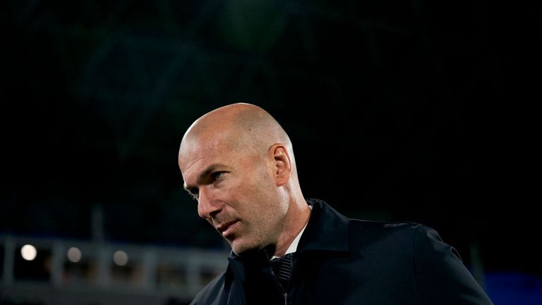A man with a bald head is wearing a dark jacket and a white shirt. He is looking to the side with a focused expression. The background is dark, and there is a blurred image of a stadium with lights and a crowd in the distance. | Zinedine Zidane's side were beaten 3-0 by Paris Saint-Germain | 730d14674040568996229b0de48e36ff4a37438bd9964a1f1d82badffd2654a6 | 001065771222 | 0 | 0 | 46 | 9 | 0 | 0 | |