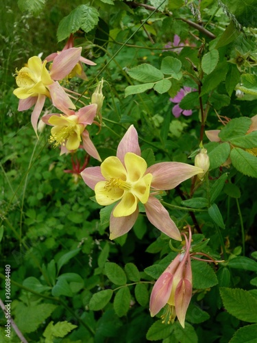 A close-up of a yellow and pink flower with a yellow center, surrounded by green foliage and other flowers in the background. | Photo Columbine and Wild Rose | fb2252257a9f463603262d0d59ad9d2abc58bdfa259c71d26c53d9ffc1d2a313 | 001065771522 | 0 | 0 | 22 | 5 | 0 | 0 | |