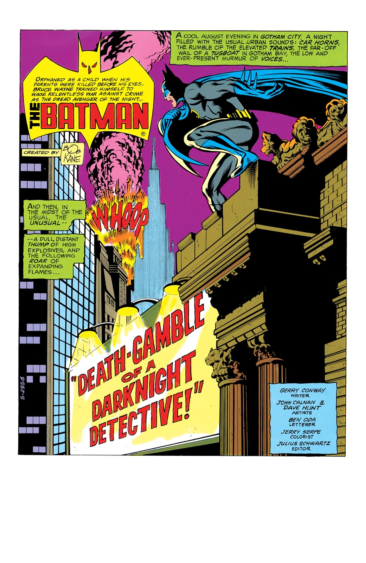 A comic book page featuring the Batman character in a dynamic pose, with a cityscape in the background. The page includes various text bubbles with dialogue, a large 'THE BATMAN' title at the top, and a 'DEATH-GAMBLE DARK KNIGHT' title at the bottom. The artwork is vibrant with a mix of purple, yellow, and red colors, and the Batman character is depicted with a cape and cowl. | Batman (1940-2011) #305 | f5e1a4ca44ed4c26218ee1a78ed592100981c4a651bf85259eb61fbdd2b603f9 | 001065771525 | 0 | 0 | 67 | 3 | 0 | 0 | |