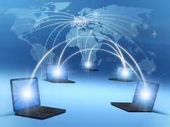 The second image shows a group of four laptops with glowing blue screens, each connected by a bright blue line to a central point above them. The laptops are placed on a surface with a blue background, and the lines form a network-like structure. The world map in the background is now overlaid with a network of lines and nodes, suggesting a global connection. The image has a more abstract and technological feel compared to the first image. | Computer global connection Stock Illustration | dca625ee2ce36fa4cb92390b48fc849862a701842f24ec7e486bb92bf954eb41 | 001065771138 | 0 | 0 | 78 | 5 | 0 | 0 | |