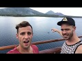 Two men are standing on a wooden platform by a lake, with a mountain in the background. The man on the left is wearing a red shirt and has a surprised expression on his face. The man on the right is wearing a black cap with a white logo and a black and white patterned shirt. Both men are pointing towards the water. | #VLOG Sailing away from Papua New Guinea | 127c011c69ab426193a19410c204a700814faec3bb023f16425b488143f8636c | 001065771615 | 0 | 0 | 63 | 7 | 0 | 0 | |