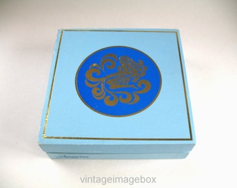 A closed blue box with a gold border and a circular gold emblem in the center. The box has a vintage look and is placed against a white background. | Vintage Max Factor Aquarius perfume toiletry storage box, c1970s | 858414f4957875d6393e88129e31c17bdd46e70d4630001ee82888ac1ab9fd9c | 001065771178 | 0 | 0 | 29 | 9 | 0 | 0 | |