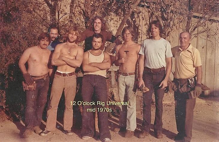 A group of men posing for a photo in the 1970s. They are standing outdoors, with a tree and a wooden fence in the background. The men are wearing casual clothing, including jeans, t-shirts, and one man is shirtless. They are all smiling and looking at the camera. The photo has a vintage look with a faded and grainy texture. | 12 O'Clock Rig Crew Universal Mid-1970's | dde1a4b5b72f0dbec8e04e34489dc71dec5b939a12a1d20228d7e9591675f64f | 001065771594 | 0 | 0 | 60 | 6 | 0 | 0 | |