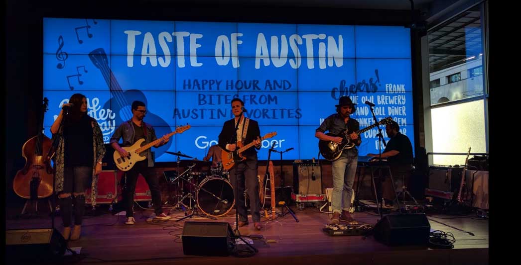 The first image shows a band performing on stage with a large screen behind them displaying the text 'TASTE OF AUSTIN' in large letters. The band consists of four members: a guitarist on the left, a drummer in the center, a guitarist on the right, and a singer in the foreground. The singer is wearing a black jacket and a white scarf, and he is holding a microphone. The guitarist on the left is wearing a denim jacket, and the guitarist on the right is wearing a hat. The drummer is seated behind a drum set, and there are various musical equipment and amplifiers around the stage. | Google Fiber Taste of Austin band | 1414eba57650056c7898cee57557b6a1b0793678dfae6de1488b5ed966644369 | 001065771681 | 0 | 0 | 107 | 6 | 0 | 0 | |
