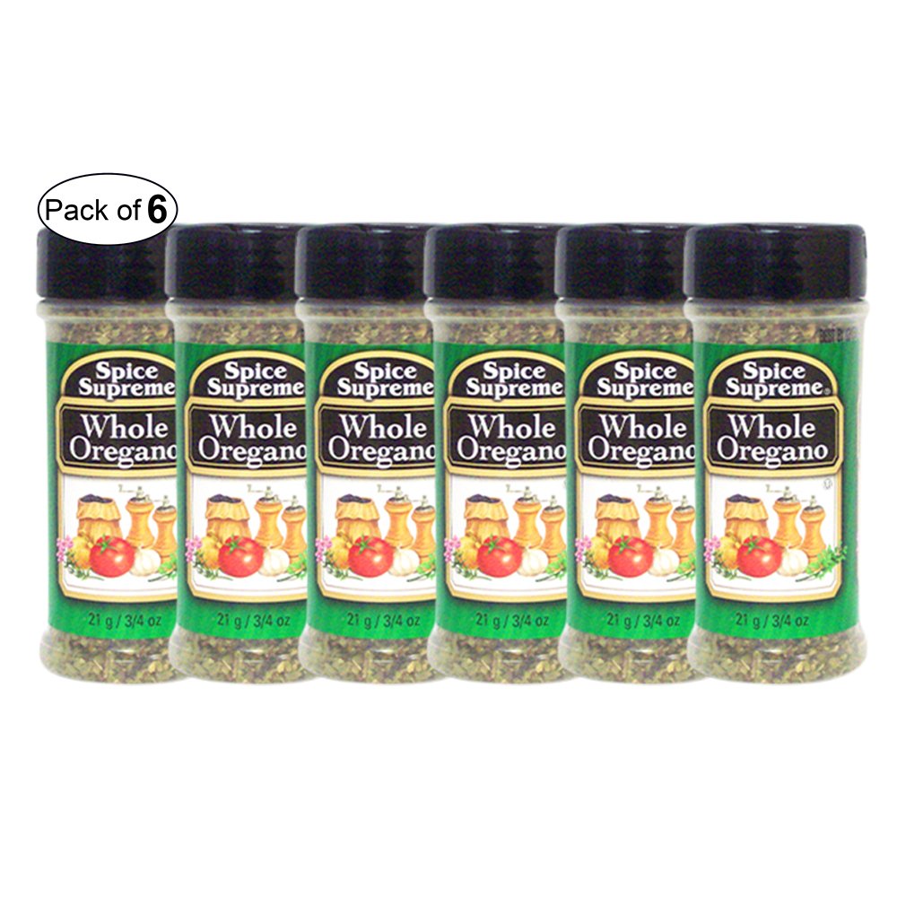 A set of six Spice Supreme Whole Oregano spice containers is displayed. Each container has a green lid and a label with the brand name 'Spice Supreme' and the product name 'Whole Oregano'. The label also features an image of tomatoes and garlic, along with the phrase 'Whole Oregano' and the words 'Spice Supreme' in a decorative font. The containers are arranged in a row, with each container slightly overlapping the one in front of it, creating a layered effect. The background is a plain white color. | Spice Supreme- Whole Oregano (21g) (Pack of 6) by Spice Supreme \xc2\xae (Image #1) | 68429121bf0bf1e27d4c4764ee410b8c19b9f8914a00aedaaa7fa508be3e6cc1 | 001065745426 | 0 | 0 | 87 | 14 | 0 | 0 | |