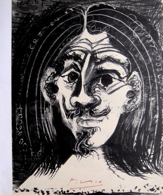 A black and white drawing of a person with a stylized, angular face and hair, featuring a signature in the bottom right corner. | Pablo Picasso signed Print Tete de Homme, 1969 | 0595f4fcf87610ab320afd176b919a4ef6ec89c3bab4776debef1a737c4d8249 | 001065745479 | 0 | 0 | 23 | 8 | 0 | 0 | |