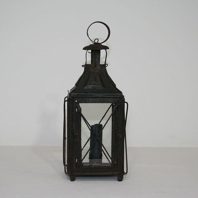 A rustic, old-fashioned lantern with a metal frame and a glass pane sits on a white surface. The lantern has a circular top with a metal ring, a handle on the side, and a metal base. The glass pane is clear, and the lantern is lit from within, casting a warm glow. | Pair of French, 19th Century Metal Lanterns For Sale 6 | 72d8faf93e128c29b1c1532a60e20b4c4bdc85be1bbc4cea02bdc13d419c1cb1 | 001065771919 | 0 | 0 | 52 | 10 | 0 | 0 | |