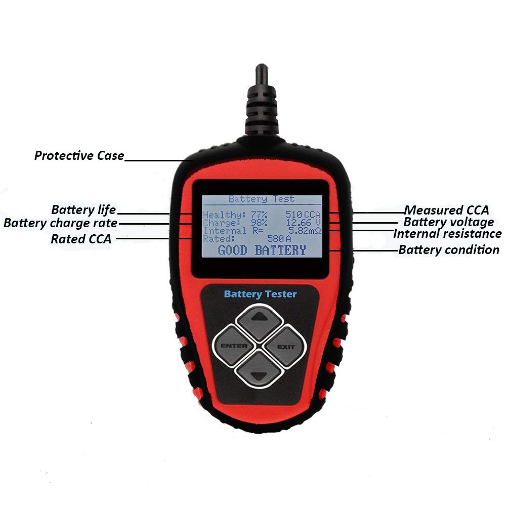 A red and black digital battery tester with a screen displaying 'GOOD BATTERY' is shown with various labels and measurements such as 'PROTECTIVE CASE', 'BATTERY LIFE', 'BATTERY CHARGE RATE', 'BATTERY VOLTAGE', 'BATTERY CAPACITY', 'BATTERY VOLTAGE', 'BATTERY CHARGE RATE', 'BATTERY LIFE', 'BATTERY CAPACITY', 'BATTERY VOLTAGE', 'BATTERY CHARGE RATE', 'BATTERY LIFE', 'BATTERY CAPACITY', 'BATTERY VOLTAGE', 'BATTERY CHARGE RATE', 'BATTERY LIFE', 'BATTERY | [Upgraded Version] Roadi 3 in 1 auto Battery Tester, Alternator& Starter Tester Compatible for 12V Domestic & Imported Car/Truck - Accurate Test with Professional User Manual & Protective case. by Roadi (Image #3) | 7d7fb11f75142b9ce2d3c595b3be80988150fafb86f76e97c90353751b7e245b | 001065772009 | 0 | 0 | 59 | 33 | 0 | 0 | |