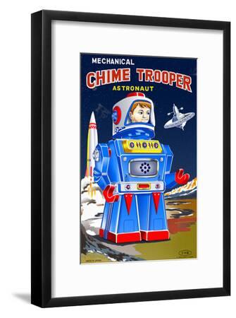 A framed vintage-style poster featuring a robot astronaut with a helmet and a rocket on its back. The poster has a retro aesthetic with a mechanical theme, including a spaceship in the background and a moon landscape. The title 'MECHANICAL CHIME TROOPER' is prominently displayed at the top, and the poster is framed with a black border. | Chime Trooper--Framed Masterprint | d14329673ffdaf4341b94555b3245364eedacadada5872eae42026a5ebb62bba | 001065771954 | 0 | 0 | 57 | 3 | 0 | 0 | |