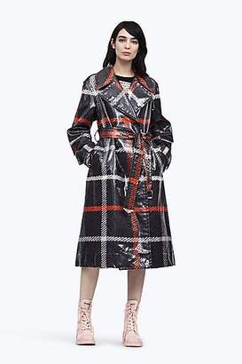 A person is standing against a white background wearing a black and red checkered raincoat with a hood, a black top, and pink high-top sneakers. | CONTEMPORARY Plaid Belted Trench | 345657d5e7807429834bcb7a323a67d2ee56be37e6c61ce6699f396f808ac4df | 001065772041 | 0 | 0 | 25 | 4 | 0 | 0 | |
