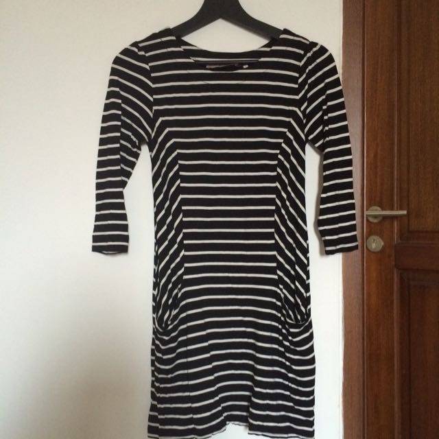A black and white striped dress is hanging on a wooden hanger against a white wall. The dress has a fitted bodice with short sleeves and a flared skirt. The stripes are vertical and the dress has a V-neckline. | Dorothy Perkins Little Striped Dress | e562a3cabb6c23cfa77854ec3dab12fd98b8af3825b8d0762b25cb7484ed4101 | 001065771982 | 0 | 0 | 39 | 5 | 0 | 0 | |