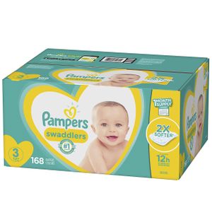 A box of Pampers Swaddlers diapers is shown with a baby's face on the front. The box is teal with a yellow heart-shaped logo and the words 'Pampers Swaddlers' and '3x Softer' written in white. The diaper size is indicated as 'Size 1' with a green and white label. The box has a barcode and the words 'For newborns and infants up to 13 lbs (6 kg)' written in white. | Pampers Size 3 for Sale in Miramar, FL | 6112de734285da22f430be914299bf760febefae942804c7d42fb112f4417ddd | 001065772397 | 0 | 0 | 70 | 8 | 0 | 0 | |