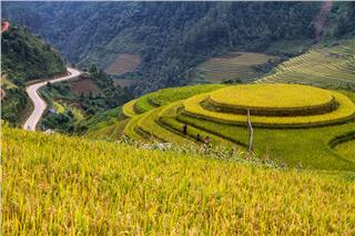 A lush green rice terraced field with a winding road on the left side, overlooking a valley with a river running through it. The terraces are neatly arranged in a series of steps, and the field is surrounded by a forested mountain range. | Stunning beauty rice terraces in Vietnam | e59c3d6cd017b25261a812034f214e7ef33376690dfcabd18edc99d67bc8a57e | 001065772588 | 0 | 0 | 43 | 6 | 0 | 0 | |